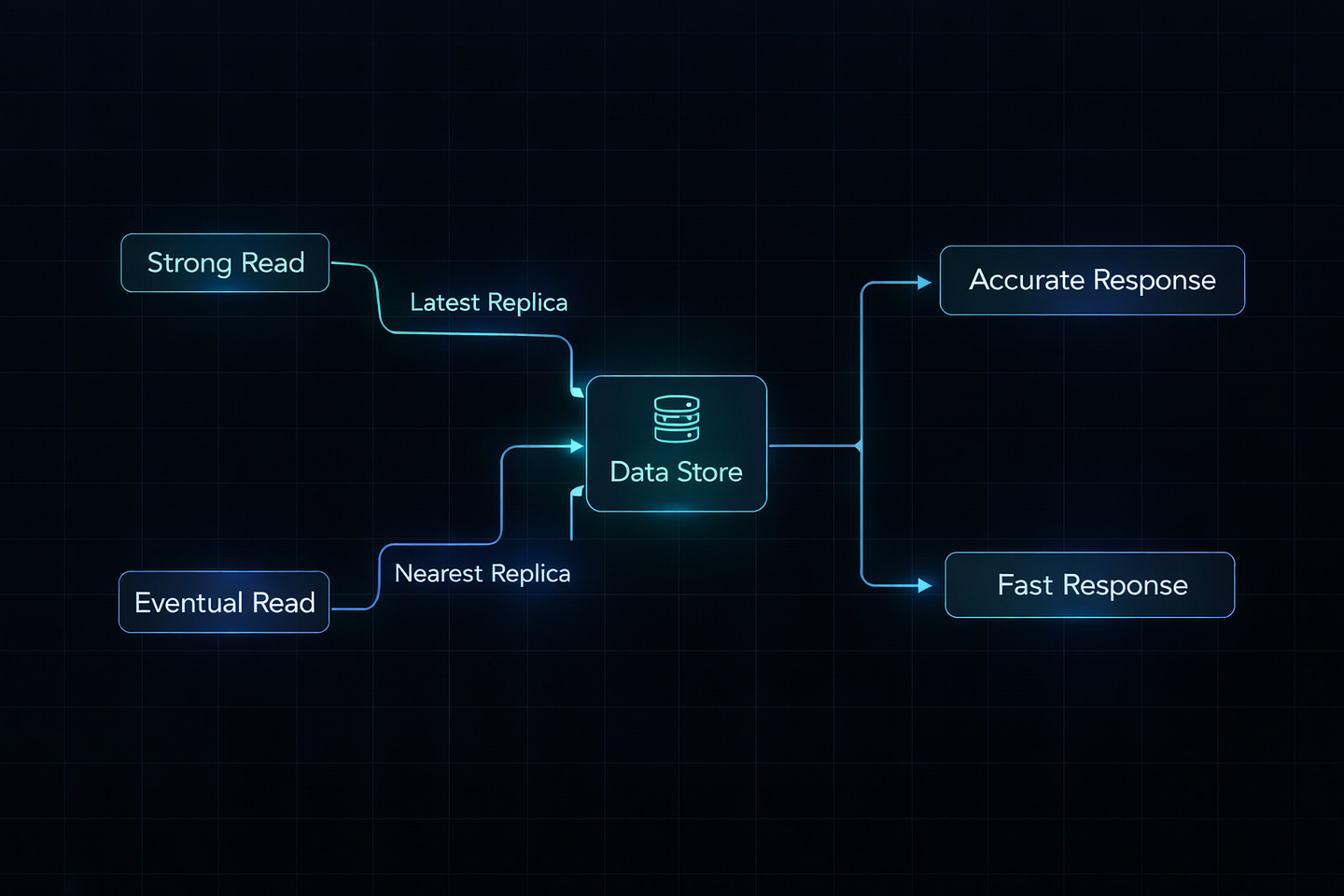 High Consistency + High Latency: Wait for all replicas Low Consistency + Low Latency: Use nearest replica