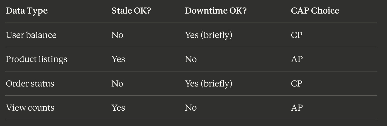 Instead of: “My system is CP” Think: “My payment flow is CP, my feed is AP, my cache is AP”